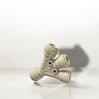 Conector rápido de 3 salidas para mangueras de 3/8''. Permite conectar múltiples mangueras con una sola entrada.